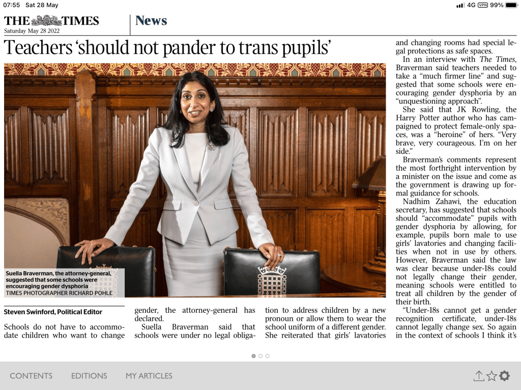 It was an edict that could have come straight out of Nazi Germany: born out of an extreme ideology, sweeping aside all the accumulated knowledge and wisdom of the actual experts in the field, relying instead on junk science and deliberate misinformation, with the effect of terrorising an entire population. If anyone thinks though that it’s only in places like Texas, where politicians are jumping on the anti-trans bandwagon, while I was writing this article the Times published this horrifying interview with the Attorney General of the UK.